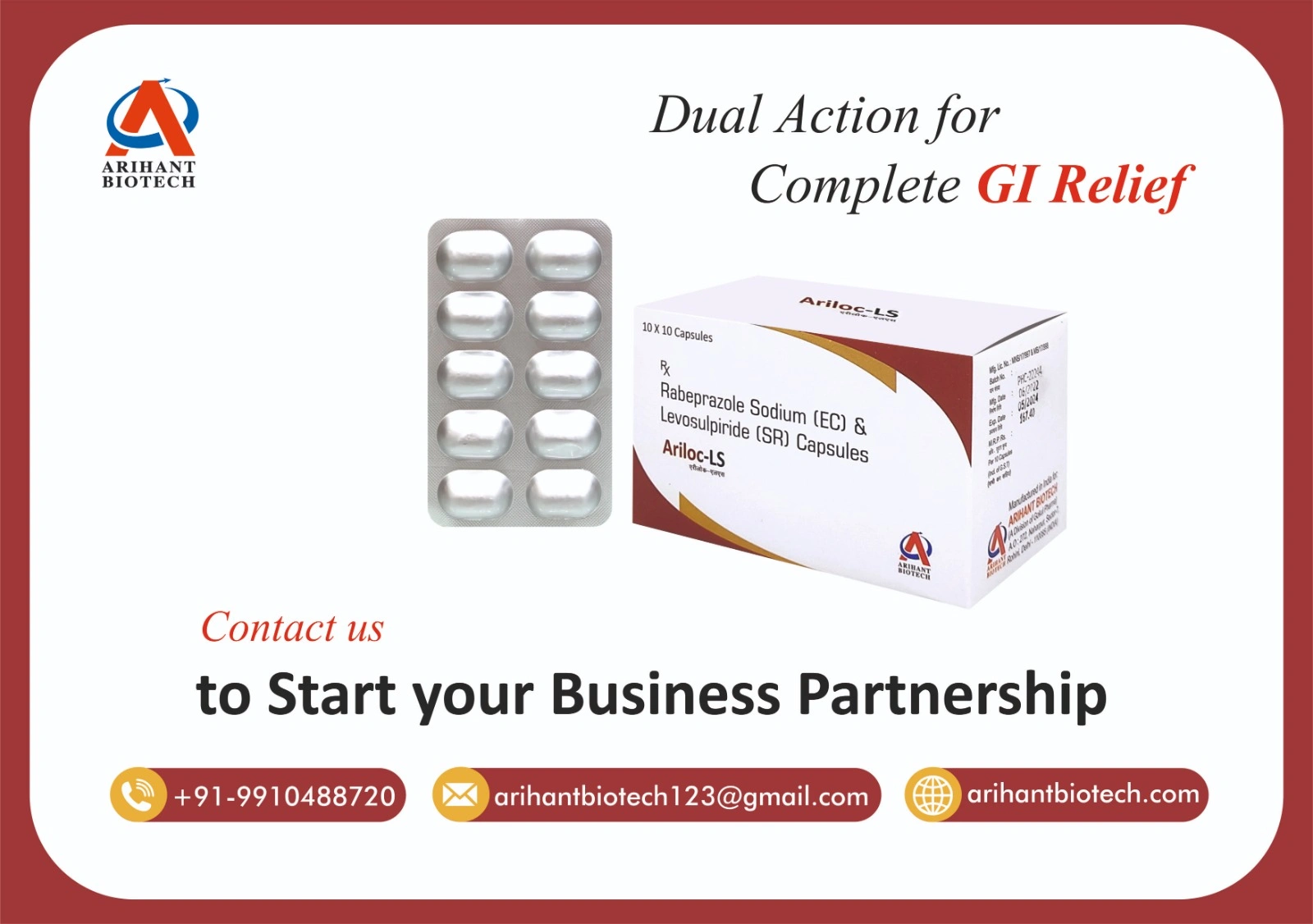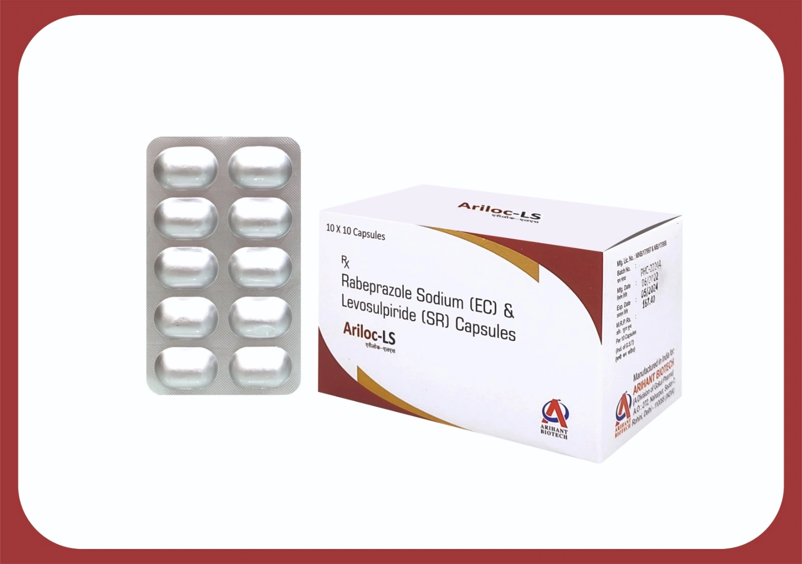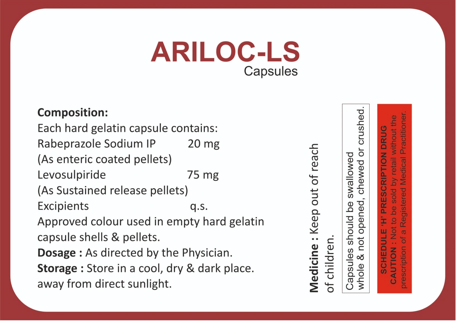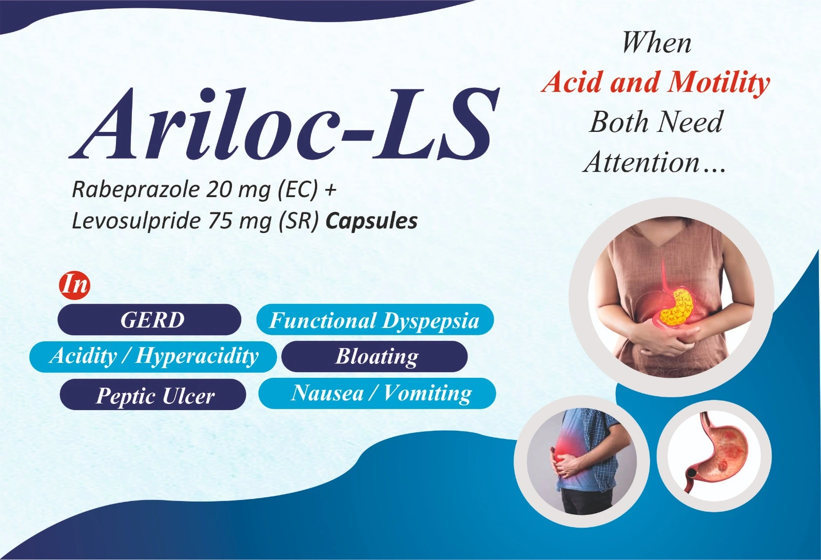 Ariloc-LS capsules contain Rabeprazole 20 mg (EC) and Levosulpiride 75 mg (SR) is a combination medicine used to treat stomach problems related to excess acid and poor digestion. Rabeprazole reduces the amount of acid produced in the stomach and helps protect the stomach lining from irritation. Levosulpiride helps improve the movement of the stomach and intestines, which supports better digestion and reduces symptoms like nausea, fullness, and stomach discomfort.
