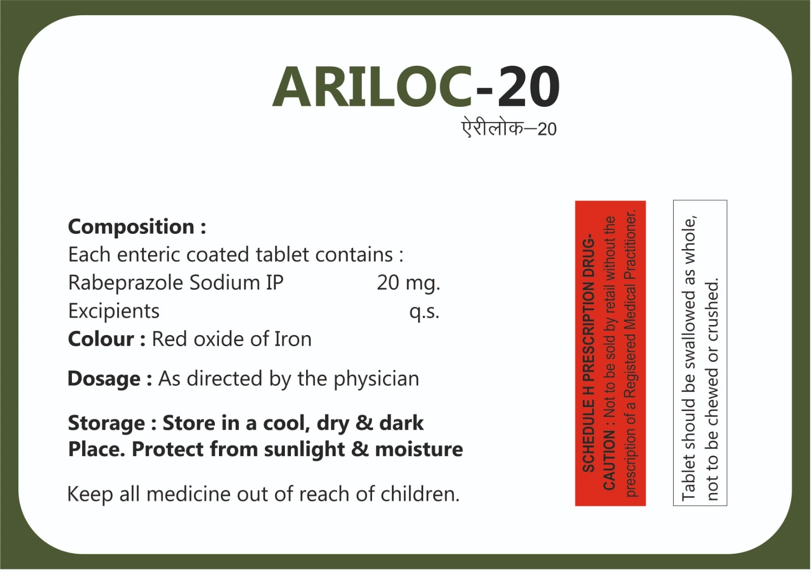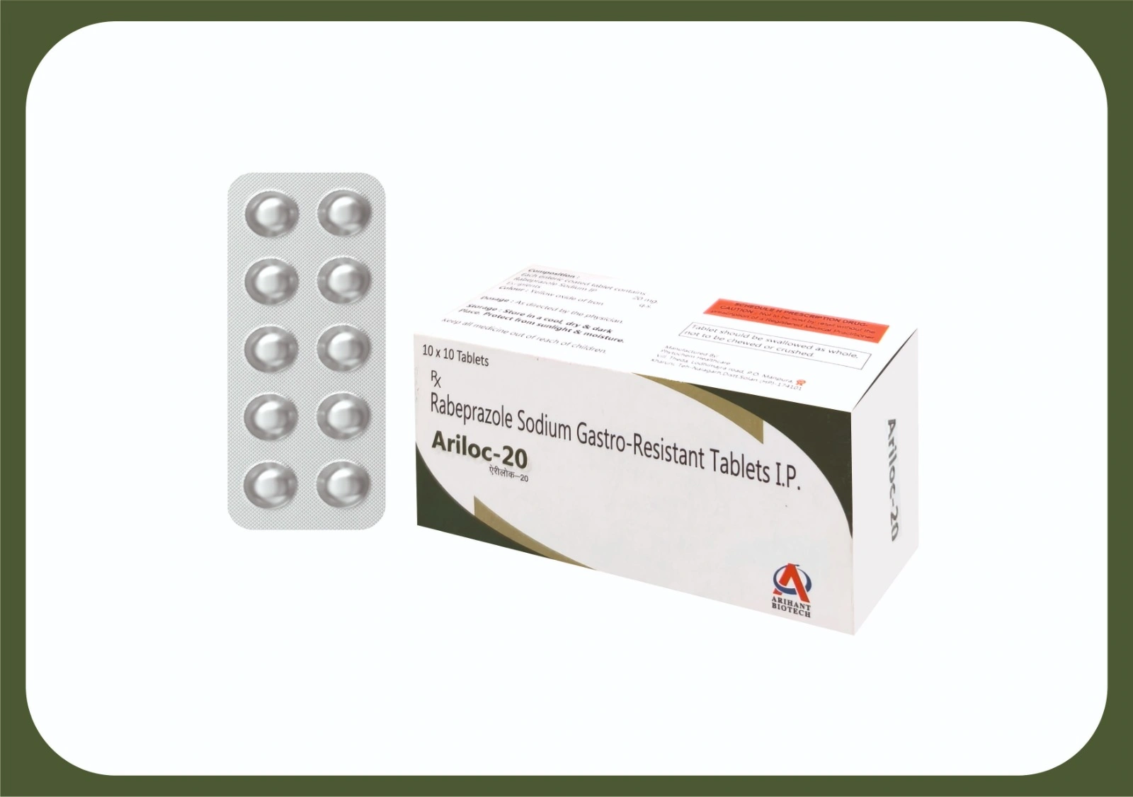 Ariloc-20 Tablet (Rabeprazole sodium 20 mg) works by blocking the proton pumps present in the stomach lining that produce acid. By inhibiting these pumps, it reduces the amount of acid released in the stomach.