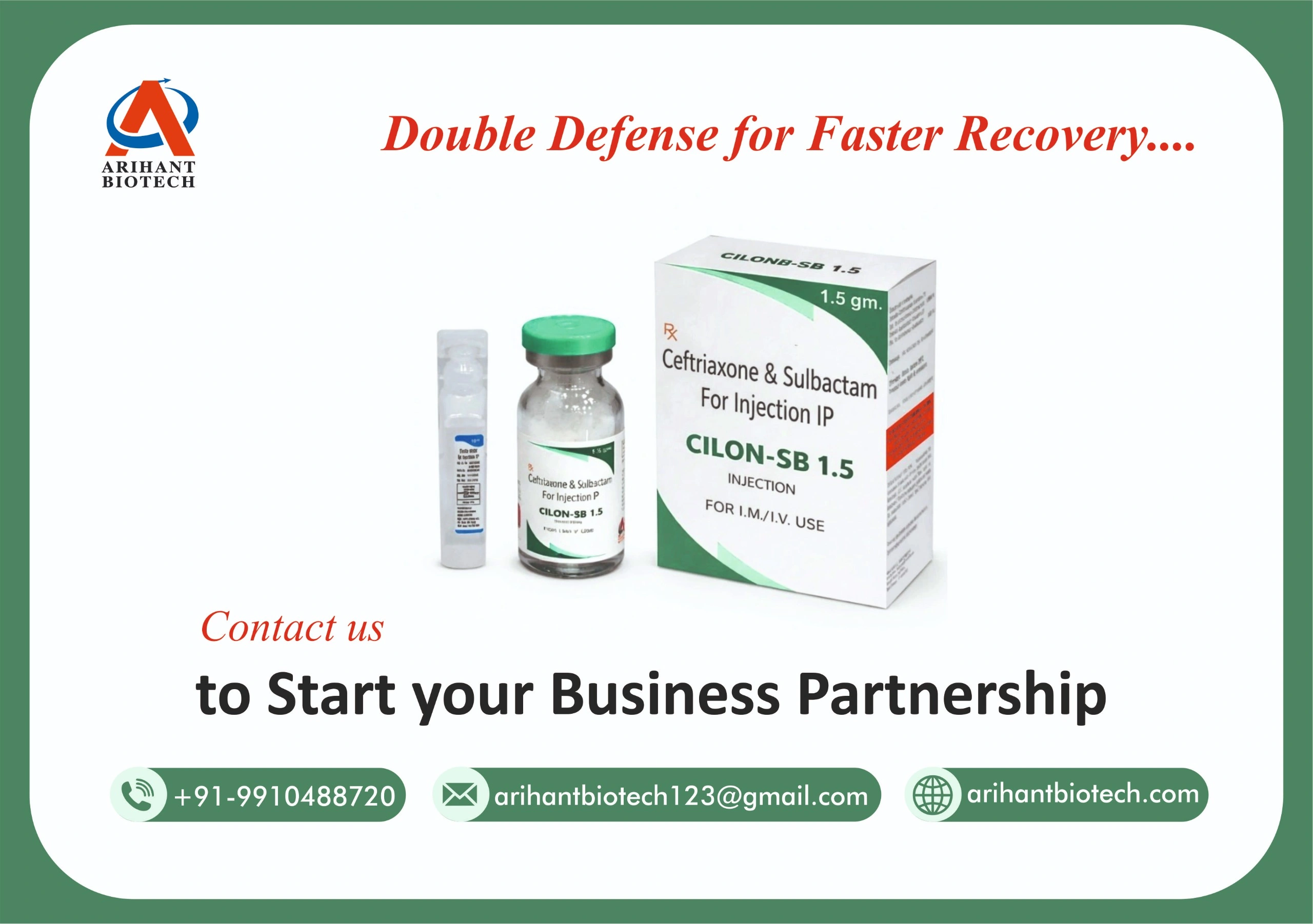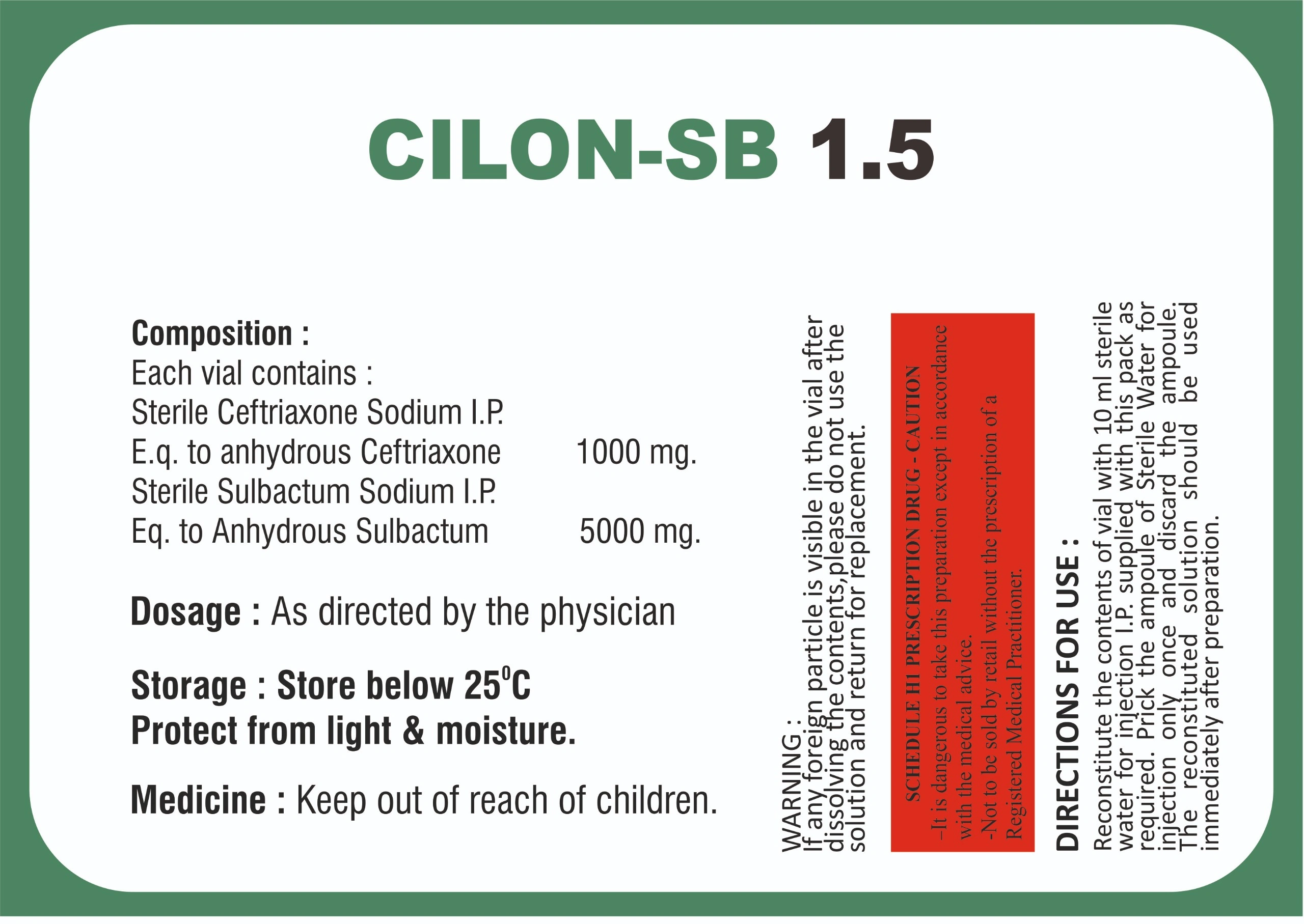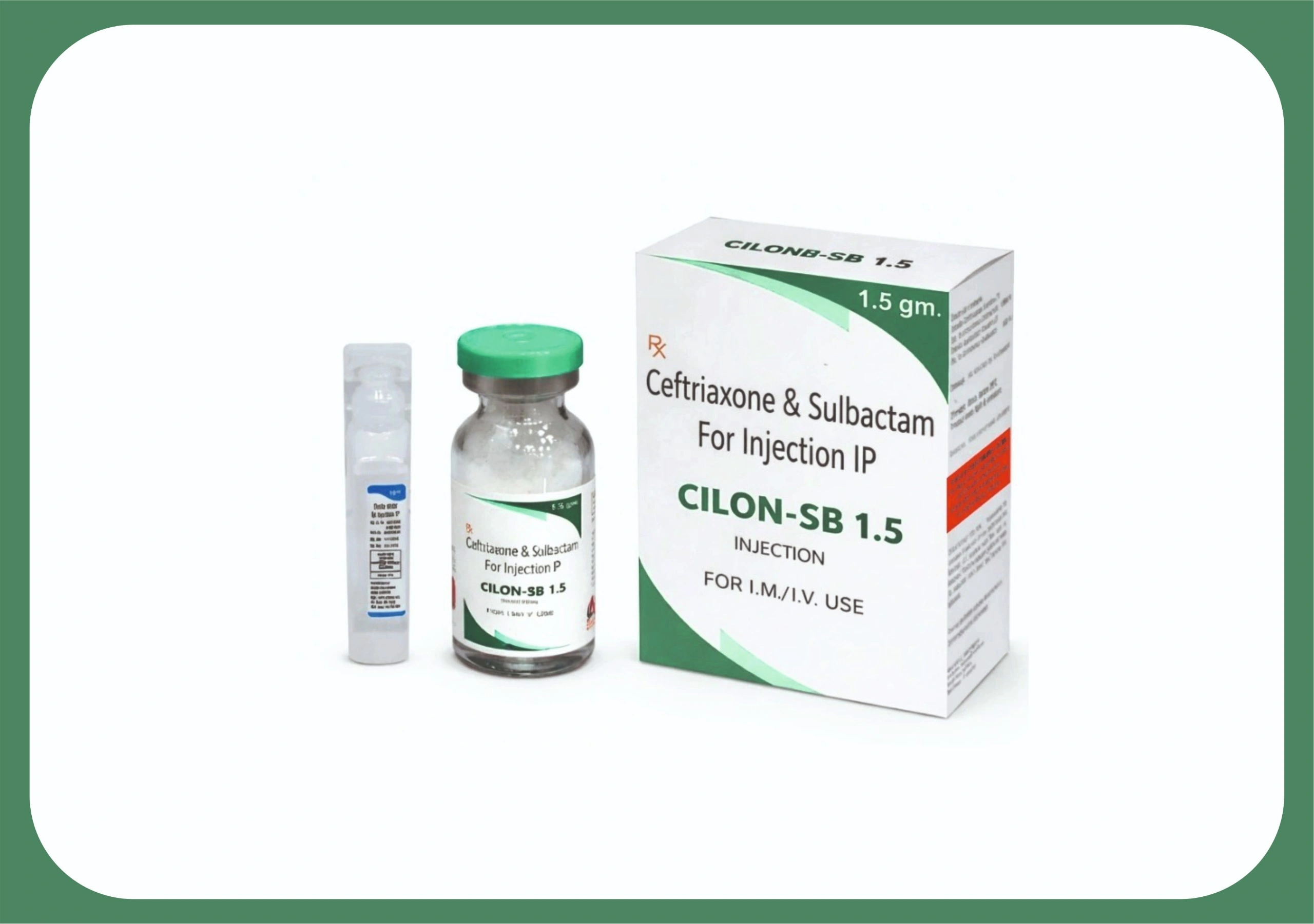 Cilon SB 1.5 injection (Ceftriaxone 1000 mg + Sulbactam 500 mg) is a sterile injectable antibiotic formulation administered under medical supervision. It combines ceftriaxone, a third-generation cephalosporin, with sulbactam, a beta-lactamase inhibitor, to enhance antibacterial effectiveness against susceptible organisms. This combination helps in the treatment of moderate to severe bacterial infections by preventing bacterial resistance and improving overall therapeutic efficacy.