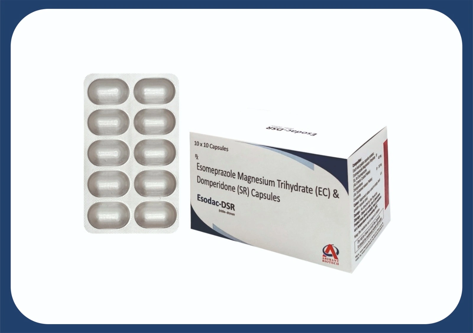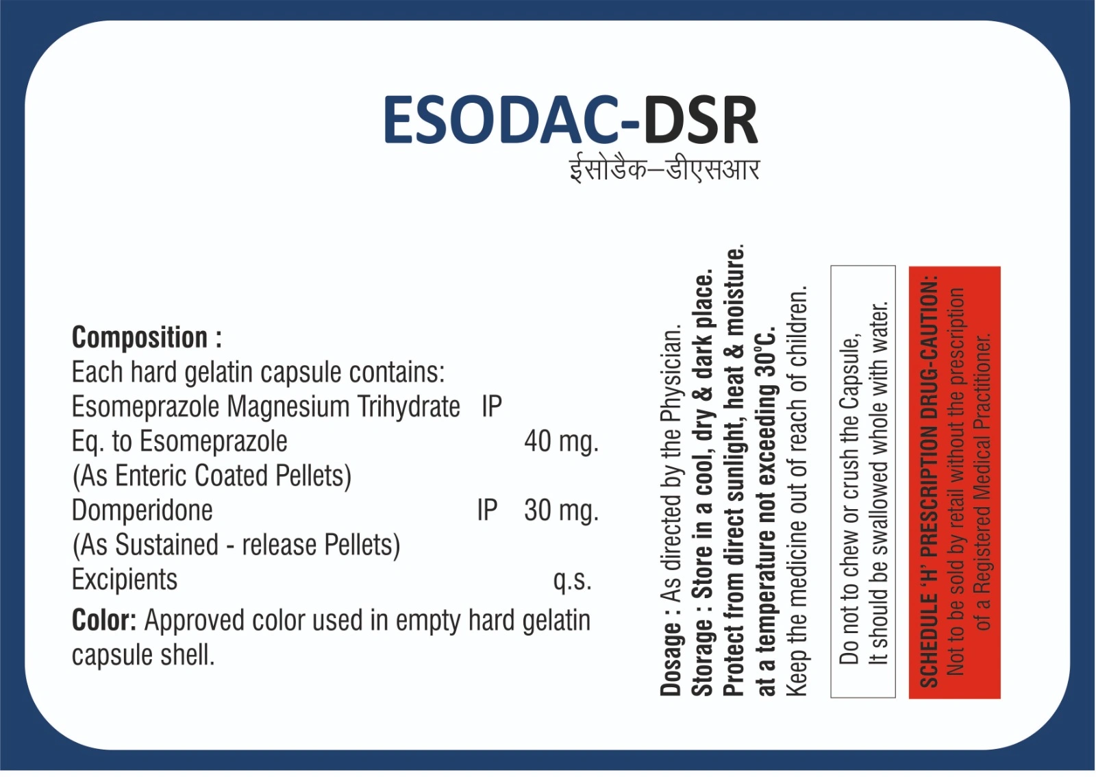 Esodac-DSR Capsule (Esomeprazole 40 mg (EC) + Domperidone 30 mg (SR) is a combination medication used to treat acid-related disorders such as gastroesophageal reflux disease (GERD), acidity, and peptic ulcers. Esomeprazole (enteric-coated) reduces stomach acid production by blocking the proton pump in the stomach lining, helping relieve heartburn and promote healing. Domperidone (sustained-release) improves gastric motility and prevents nausea and vomiting by enhancing stomach emptying. Together, they provide effective relief from acid reflux, bloating, and discomfort associated with delayed gastric emptying.