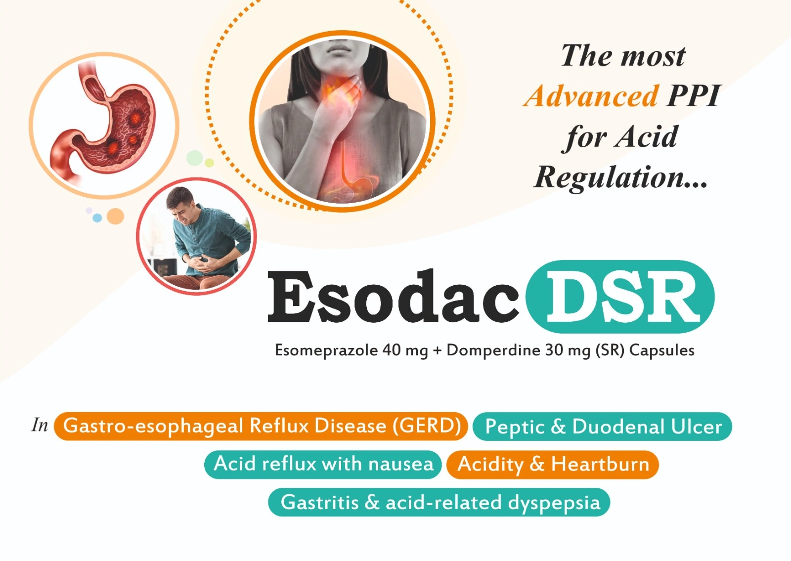 Gastroesophageal Reflux Disease (GERD): A chronic digestive disorder in which stomach acid frequently flows back into the esophagus, causing symptoms such as heartburn, regurgitation, and discomfort. Esodac-DSR Capsule (Esomeprazole 40 mg (Ec) + Domperidone 30 mg (Sr) ) controls acid production, providing relief and preventing further esophageal damage.
