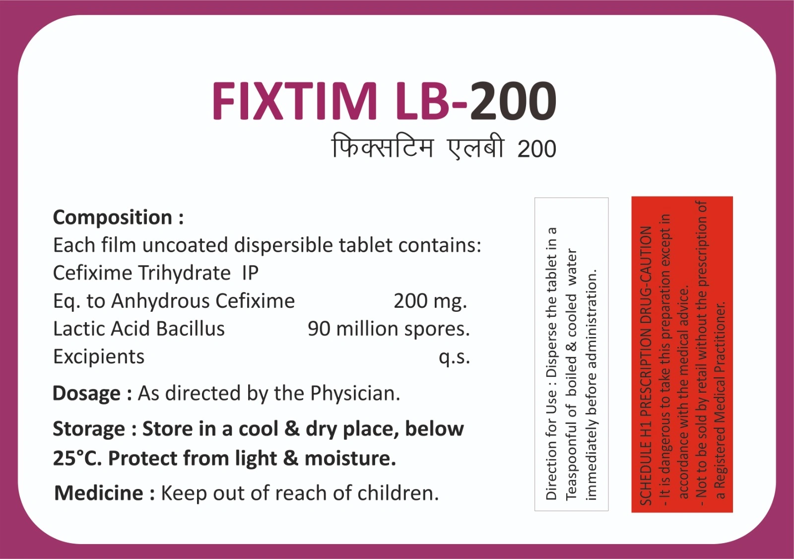 Drug-Drug Intelligent : Fixtim LB-200 Tablet (Cefixime 200 Mg + Lactic Acid Bacillius Dispersible) may connected with certain immunizations (BCG, cholera antibody, typhoid immunization), anticoagulant drugs (warfarin), and anticonvulsant drugs (carbamazepine).