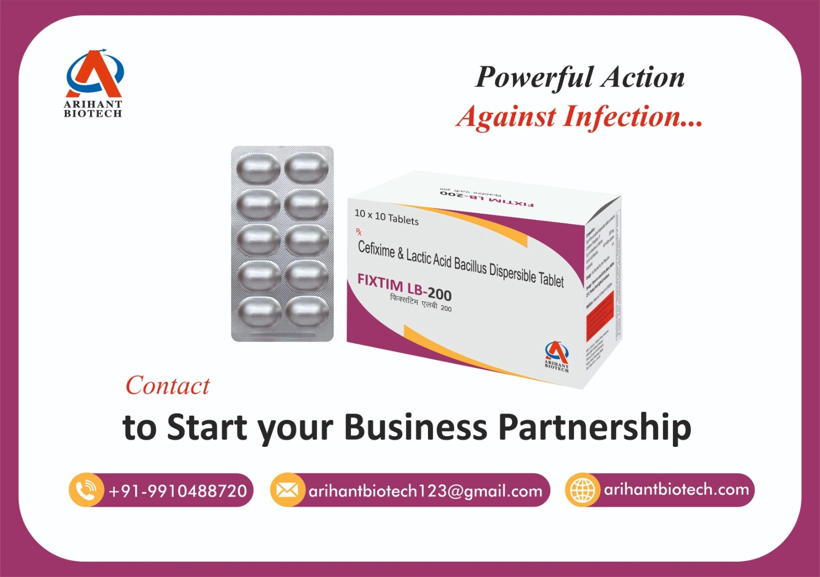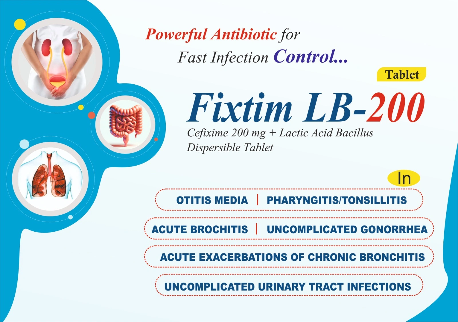 Fixtim LB-200 Tablet is a combination of (Cefixime 200 Mg + Lactic Acid Bacillius Dispersible) is an anti-microbial utilized to treat different bacterial diseases. It is viable against contaminations in the lungs, throat, kidneys, bladder, ureter, and urethra. Furthermore, it is utilized to treat gonorrhea, a sexually transmitted contamination. Fixtim LB-200 Tablet (Cefixime 200 Mg + Lactic Acid Bacillius Dispersible) works by murdering microscopic organisms and avoiding their multiplication, hence controlling and disposing of diseases.