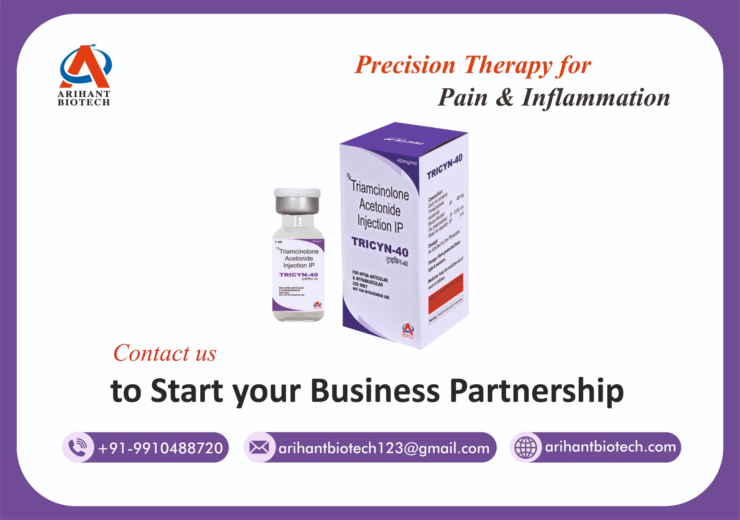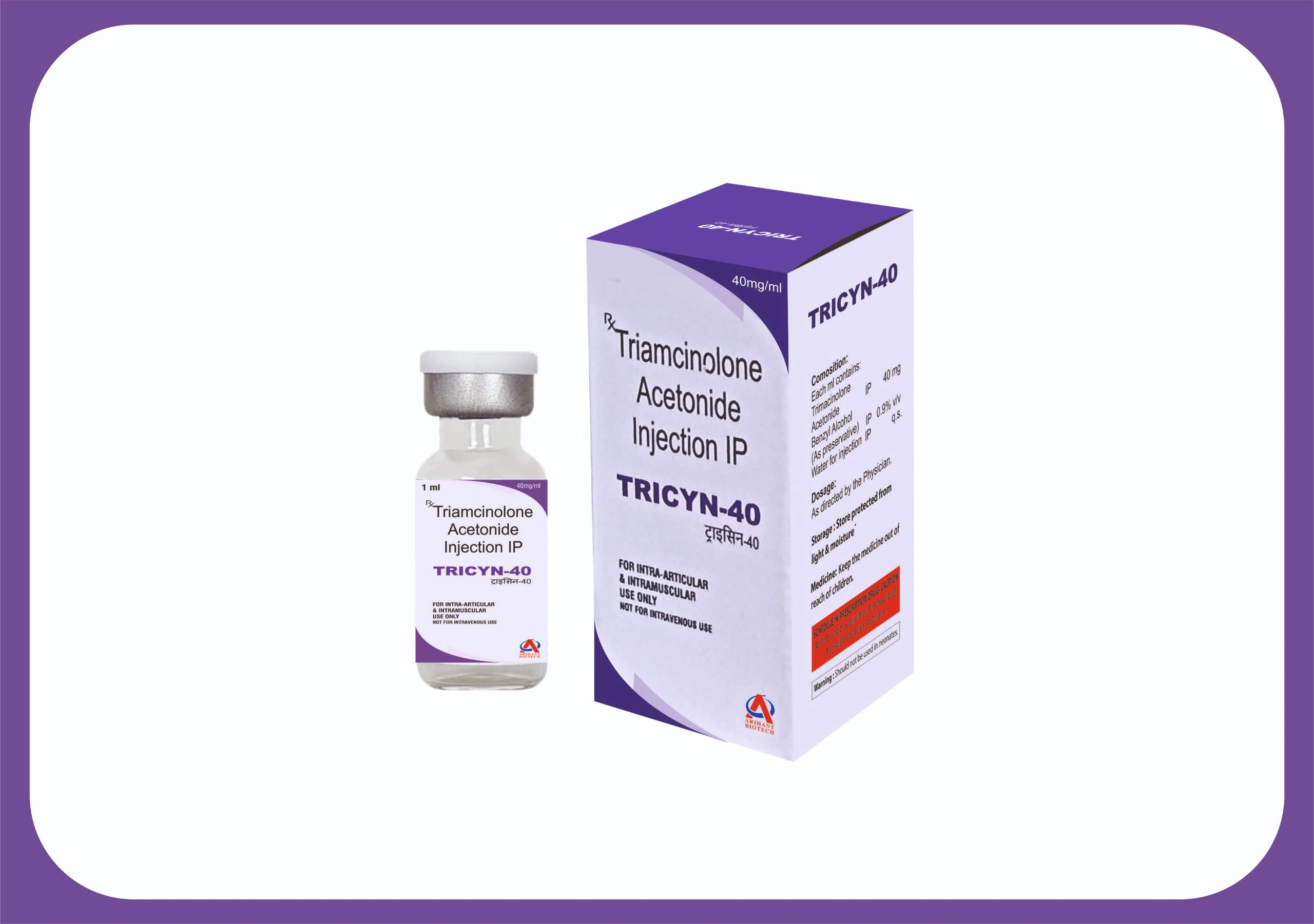 Tricyn-40 Injection (Triamcinolone Acetonide 40 mg) is a sterile corticosteroid preparation intended for parenteral administration. Tricyn-40 Injection (Triamcinolone Acetonide 40 mg) is a synthetic glucocorticoid with anti-inflammatory and immunosuppressive properties. Tricyn-40 Injection (Triamcinolone Acetonide 40 mg) helps reduce inflammation, swelling, and allergic reactions by suppressing the body’s immune response.